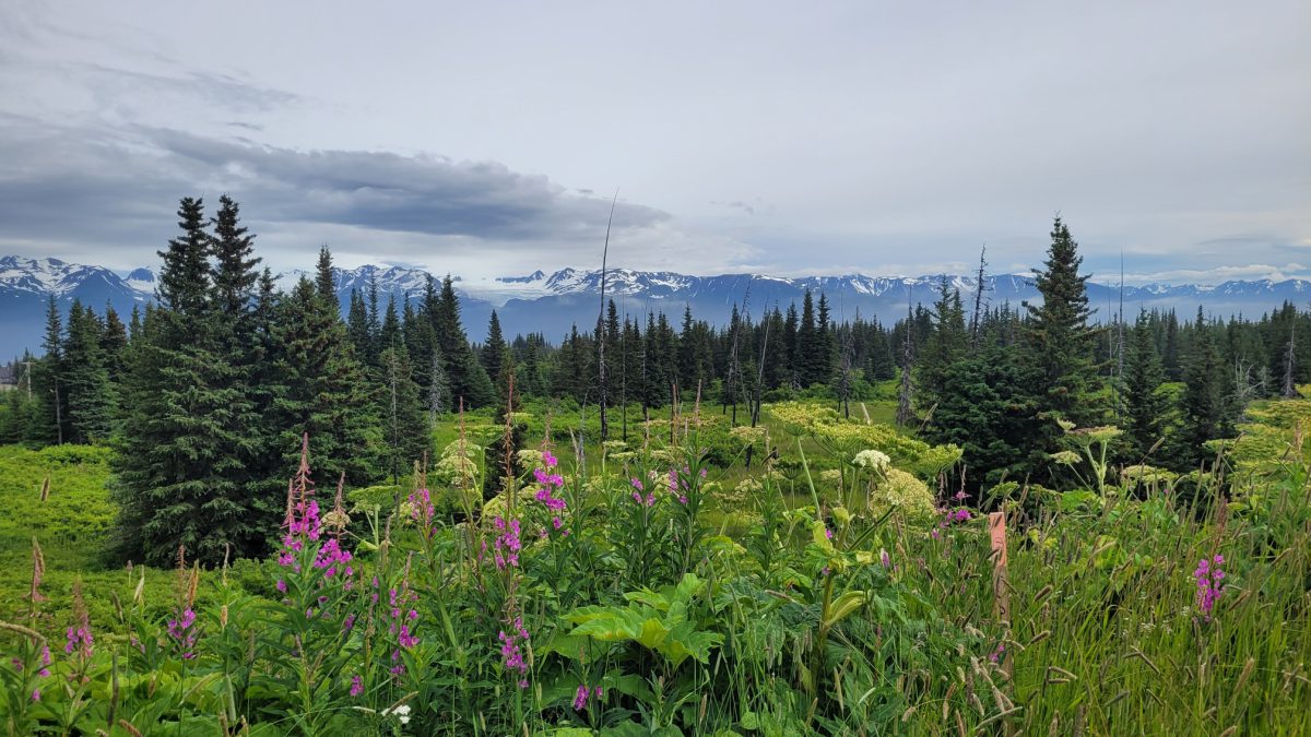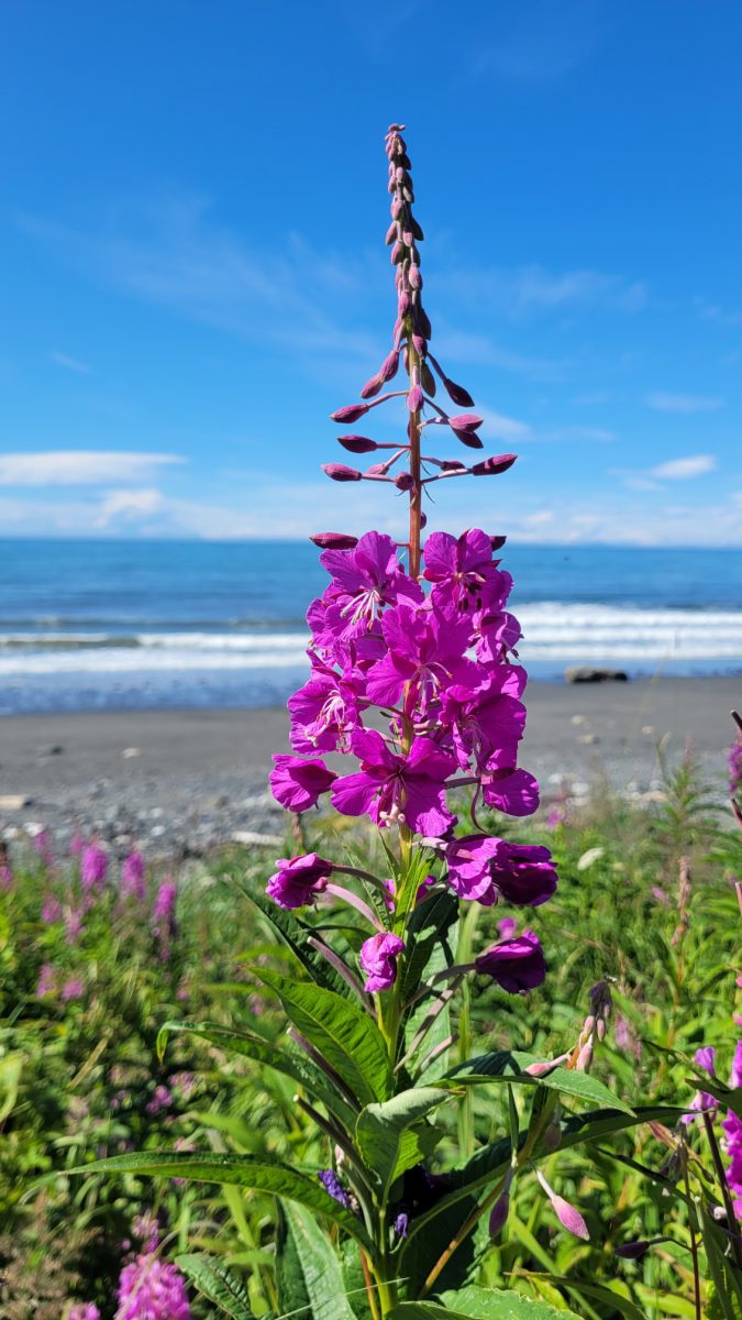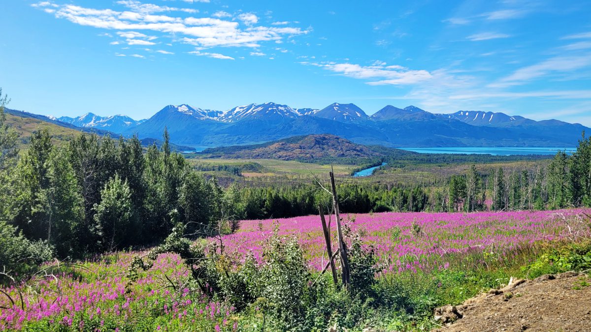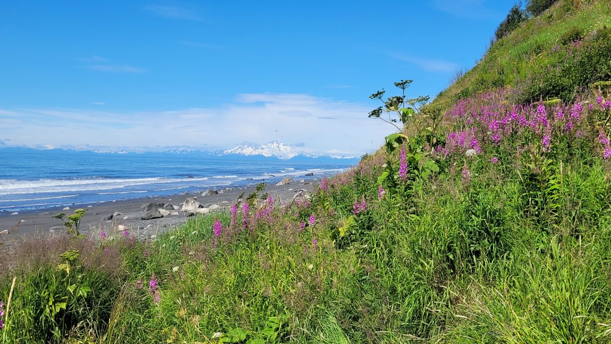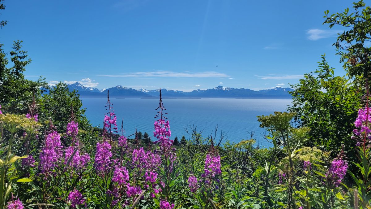 Auch diesmal war schon die Anreise wieder ein Sightseeing-Highlight. Wir fuhren am Cook Inlet entlang und bekamen dabei immer wieder tolle Ausblicke auf die verschneiten Vulkane der Aleutenkette am anderen Ufer, gesäumt von den hier allgegenwärtigen Fireweed Blumen (ich glaube, die heißen Buschwindröschen auf Deutsch). Seit Tag eins begleiten uns die rosa Blümchen durch Alaska.