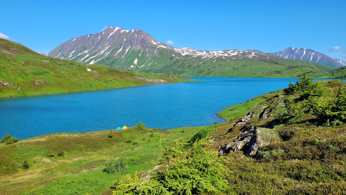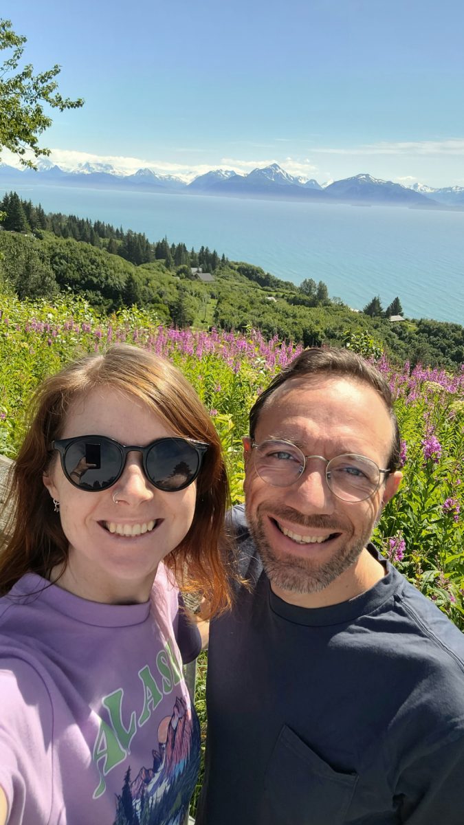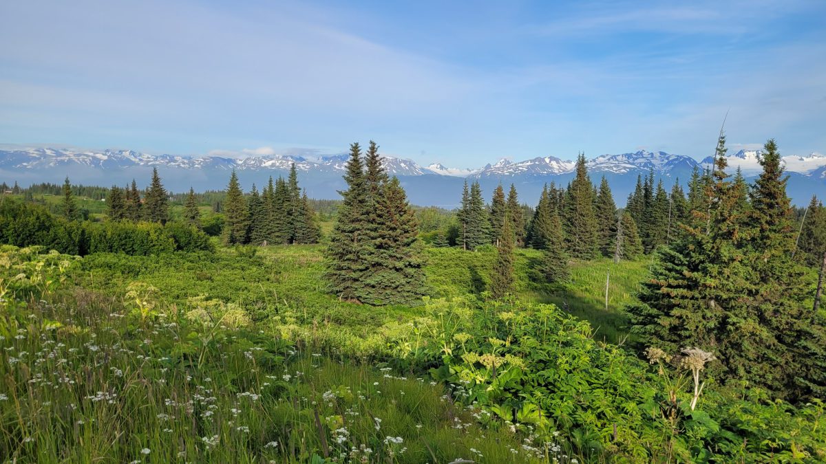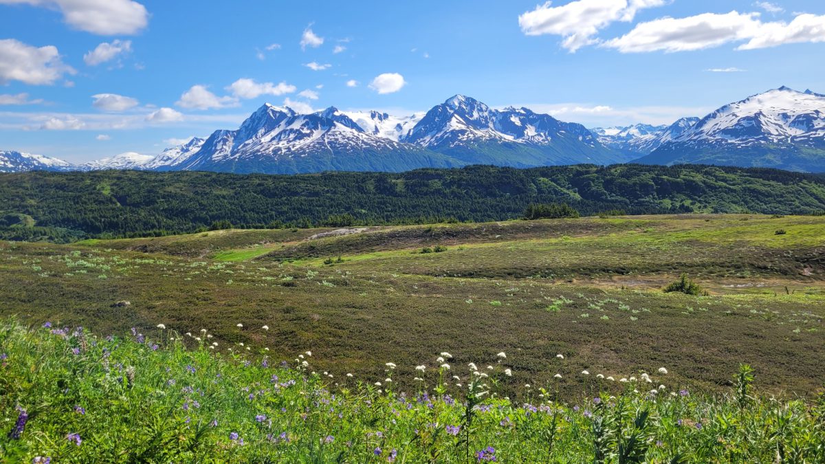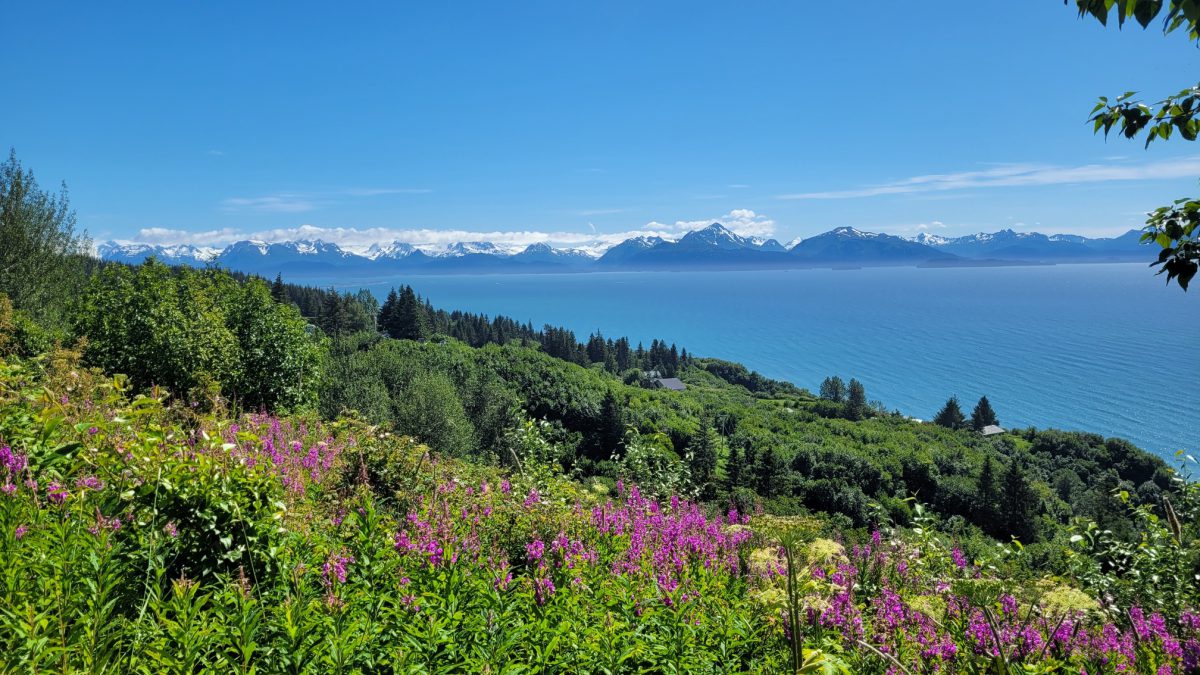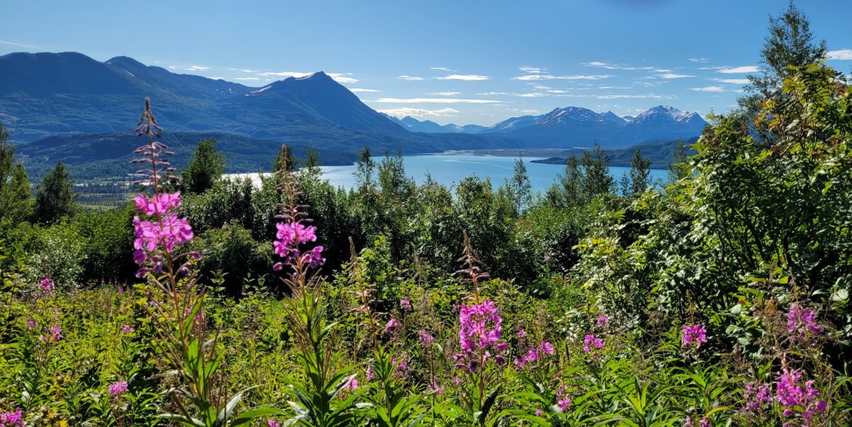 Auch diesmal war schon die Anreise wieder ein Sightseeing-Highlight. Wir fuhren am Cook Inlet entlang und bekamen dabei immer wieder tolle Ausblicke auf die verschneiten Vulkane der Aleutenkette am anderen Ufer, gesäumt von den hier allgegenwärtigen Fireweed Blumen (ich glaube, die heißen Buschwindröschen auf Deutsch). Seit Tag eins begleiten uns die rosa Blümchen durch Alaska.
