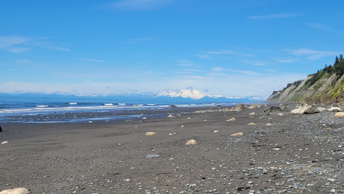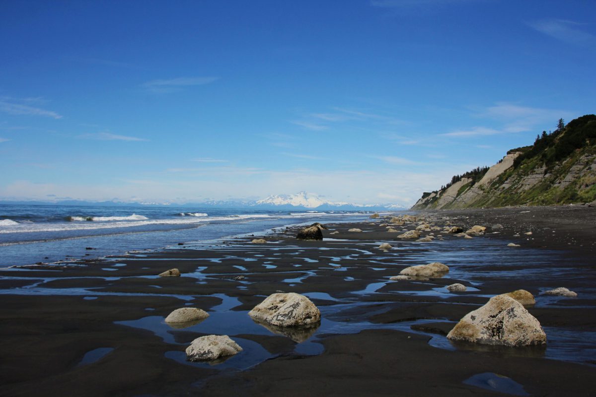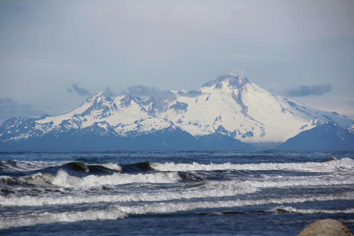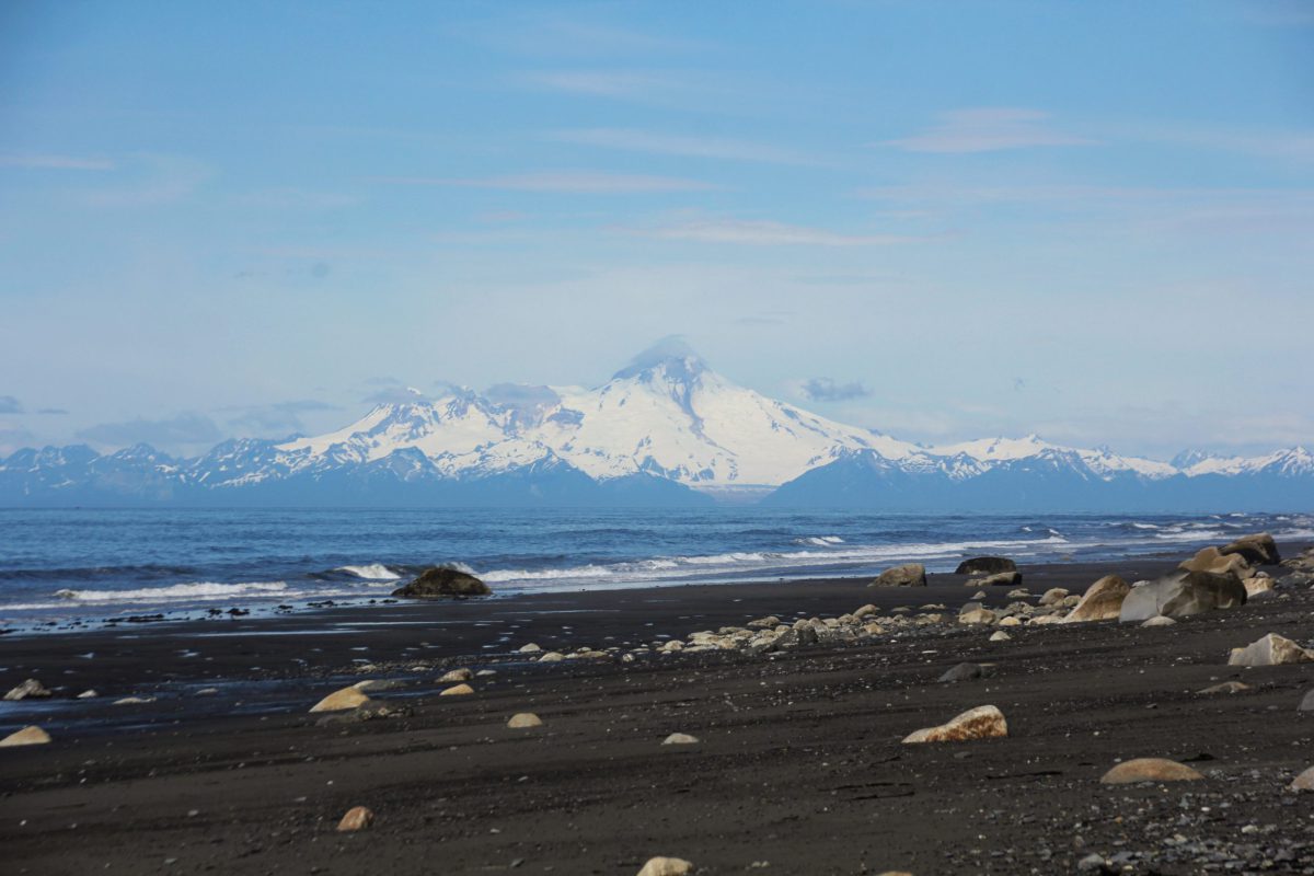 Das war uns eindeutig zu teuer für eine Wanderung, so begnügten wir uns mit einer etwas weniger spektakulären Mini-Wanderung auf dem Diamond Creek Trail. Ein kurzer Wanderpfad durch den Wald spuckte uns schließlich direkt am Strand aus, der uns erneut Ausblicke auf die Vulkane der Aleutenkette und besonders auf den über 3.000 Meter hohen Iliamna bescherte. Ein Strand mit Vulkanblick, das hat schon was!