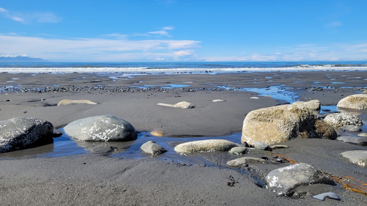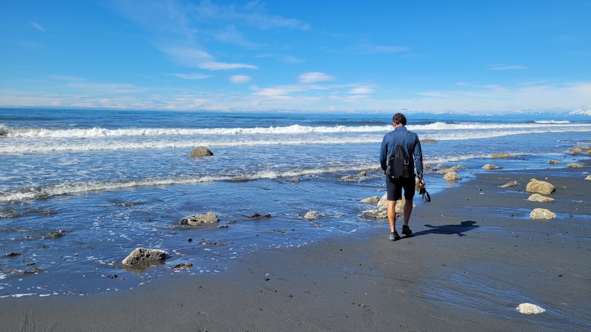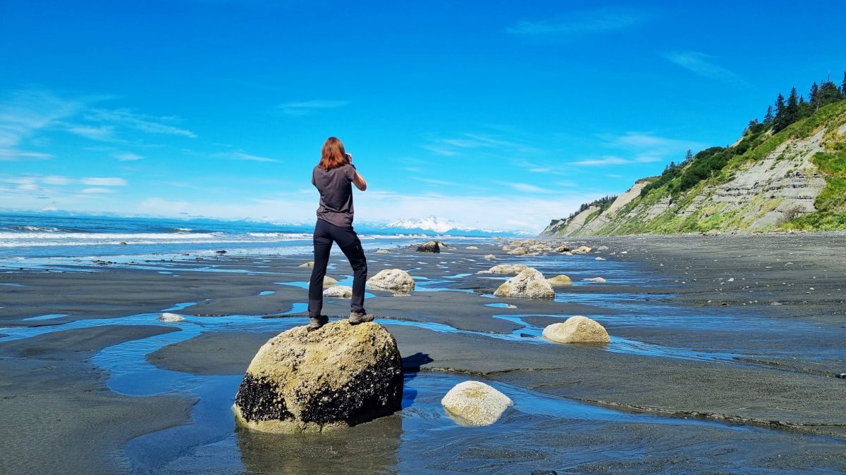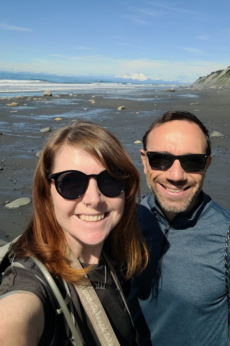 Das war uns eindeutig zu teuer für eine Wanderung, so begnügten wir uns mit einer etwas weniger spektakulären Mini-Wanderung auf dem Diamond Creek Trail. Ein kurzer Wanderpfad durch den Wald spuckte uns schließlich direkt am Strand aus, der uns erneut Ausblicke auf die Vulkane der Aleutenkette und besonders auf den über 3.000 Meter hohen Iliamna bescherte. Ein Strand mit Vulkanblick, das hat schon was!