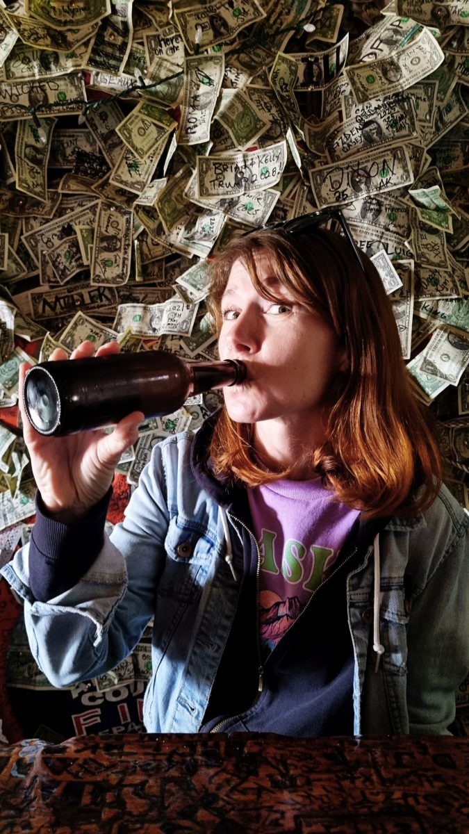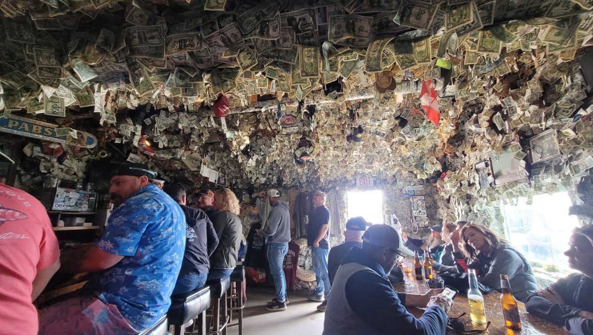 Was wir uns jedoch nicht entgehen ließen, war ein Besuch im Salty Dawg Saloon. Diese Kultkneipe besteht seit 1957 und seitdem werden täglich mehrere 1-Dollar-Noten an die Wände gepinnt. Diese „Tradition“ fing wohl mal damit an, dass ein Fischer seinem noch nicht vom Fischfang zurückgekehrten Kumpel ein Bier ausgeben wollte, und deshalb einfach schon mal das Geld für ihn hinterlegt hatte. So sind die Wände und die Decke hier nun übervoll mit 1-Dollar-Scheinen. Hier hätten wir uns unseren Bärenausflug vielleicht zusammensammeln können.