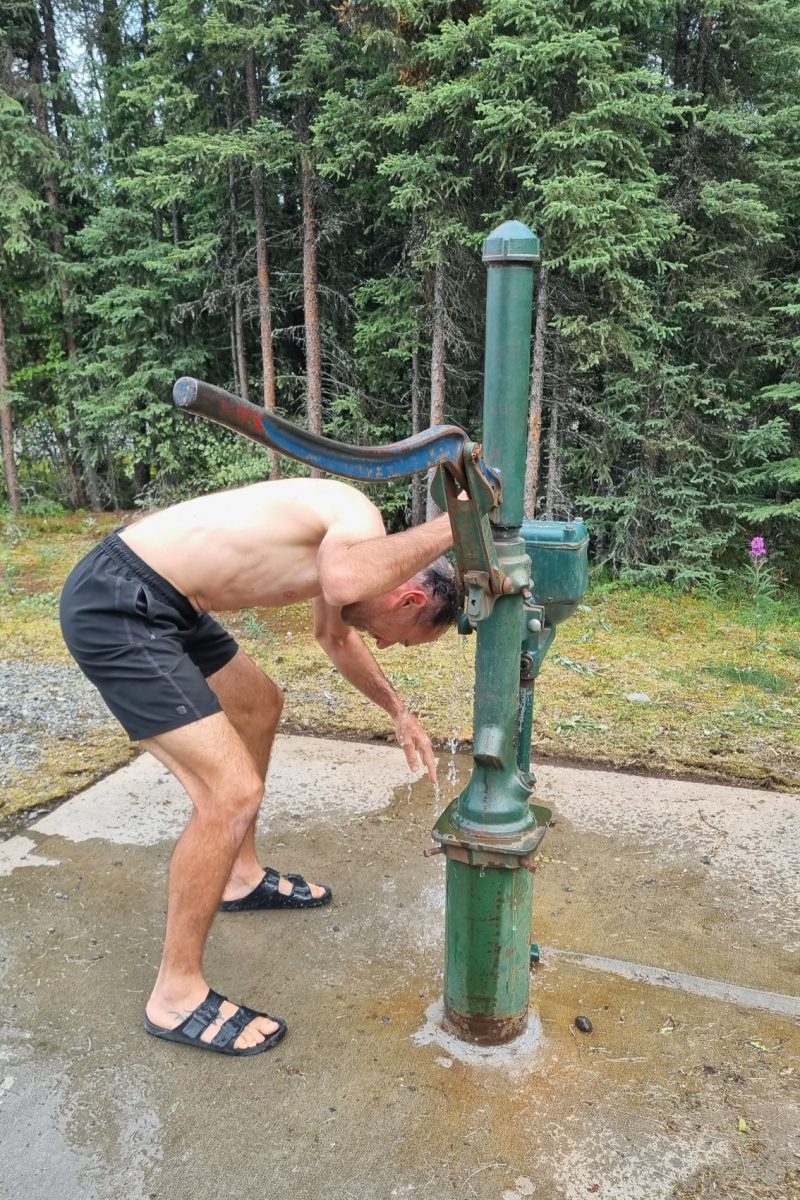 Am kleinen Watson Lake gibt es einen kostenlosen Campground mit drei schön angelegten Plätzen, Bänken, Feuerstellen, WC und sogar einer altmodischen Wasserpumpe, wie meine Oma sie auf dem Hof hatte. Als wir ankamen, waren zwar schon alle Plätze belegt, aber es gab auch so genug Platz, um das besch… Wetter auszusitzen.