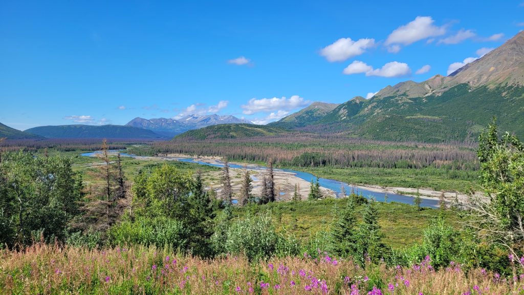 Erstmal genossen wir den Ausblick auf den großen weißen Berg, eingerahmt von Fireweed-Blüten und dem Susitna Fluss im Vordergrund. Was für ein Panorama!