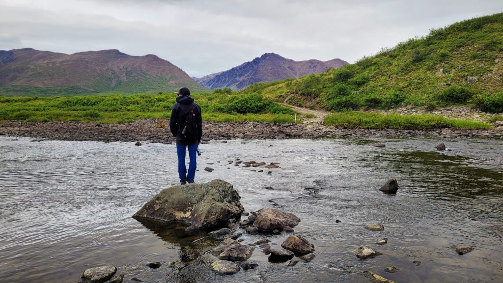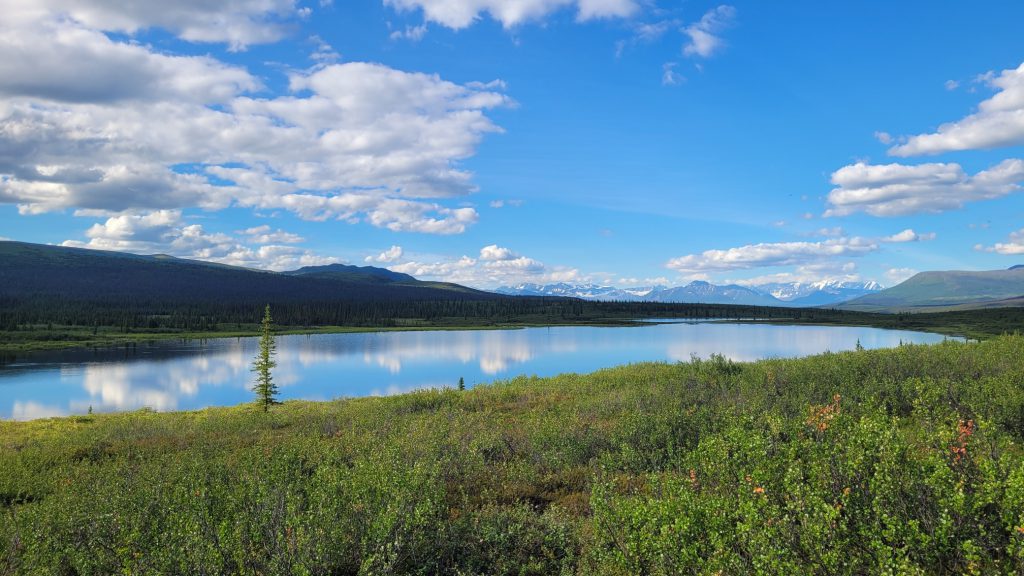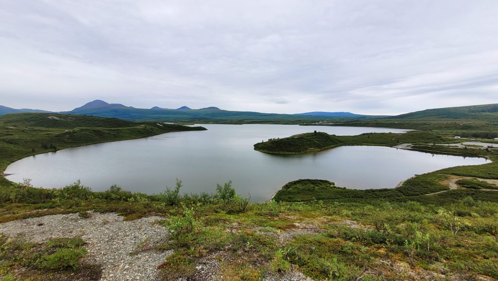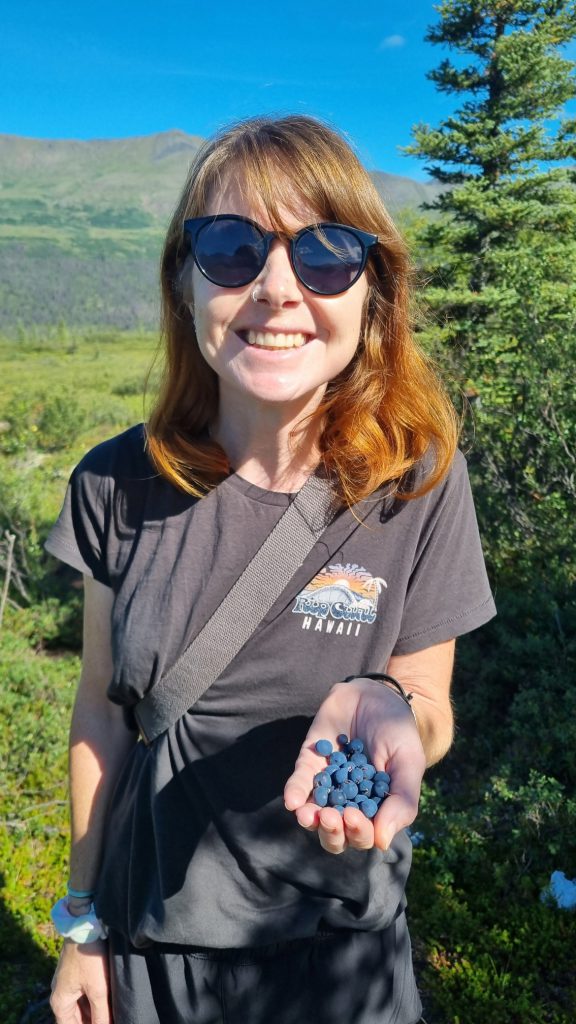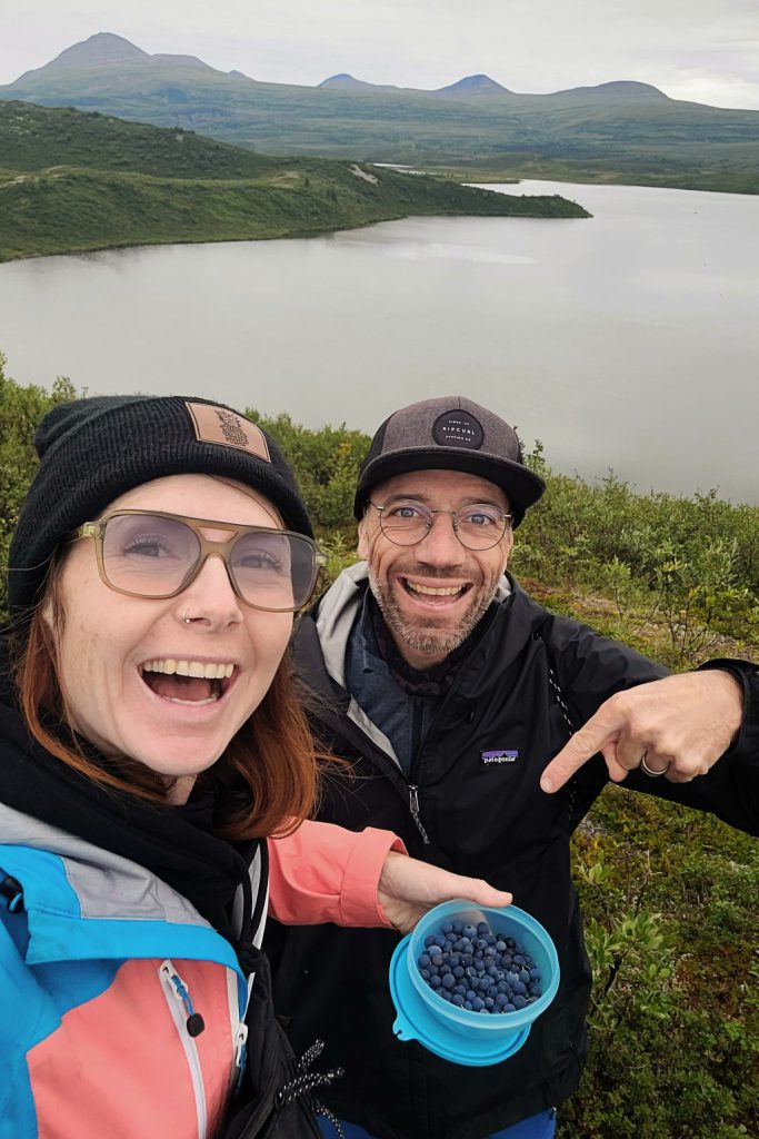 Da uns nach etwas Bewegung war, legten wir am kleinen Snodgrass See einen Stopp ein, um ein bisschen zu wandern. Uns begegnete ein Mann, der uns davor warnte, dass gerade ein Grizzly unweit vom Trail saß und ein Karibu verspeiste. Wir bewaffneten uns also mit Glocke und Bärenspray, aber leider (oder zum Glück) bekamen wir den Bären nicht zu Gesicht. Wir hatten in Alaska eindeutig mehr Glück mit Bergen als mit Wildlife. Dafür fand ich aber weitere Blaubeeren. Die sind auf jeden Fall ungefährlicher und schmecken wahrscheinlich auch besser.