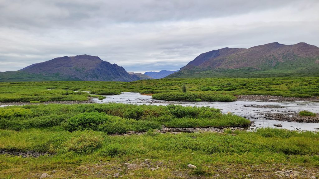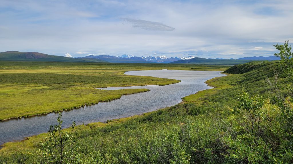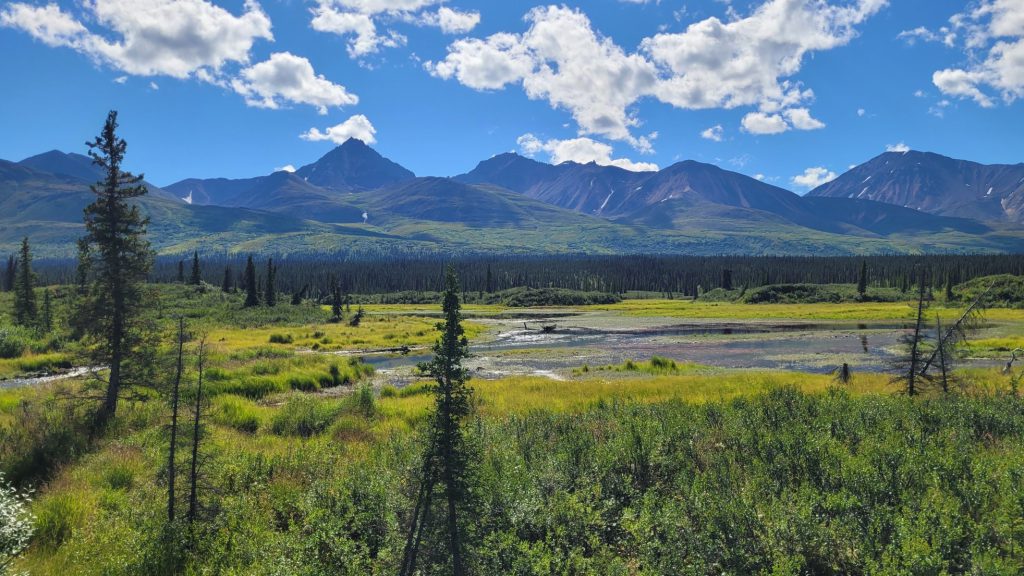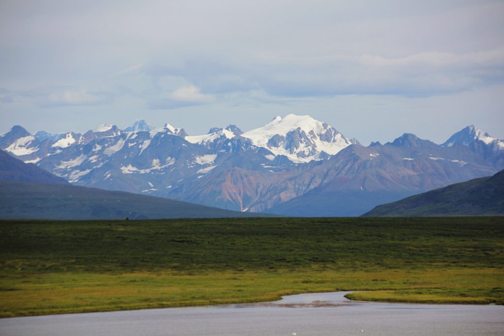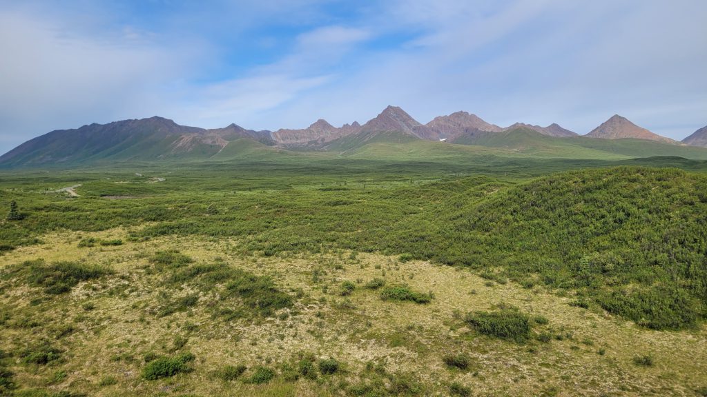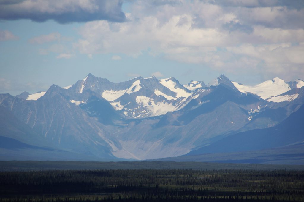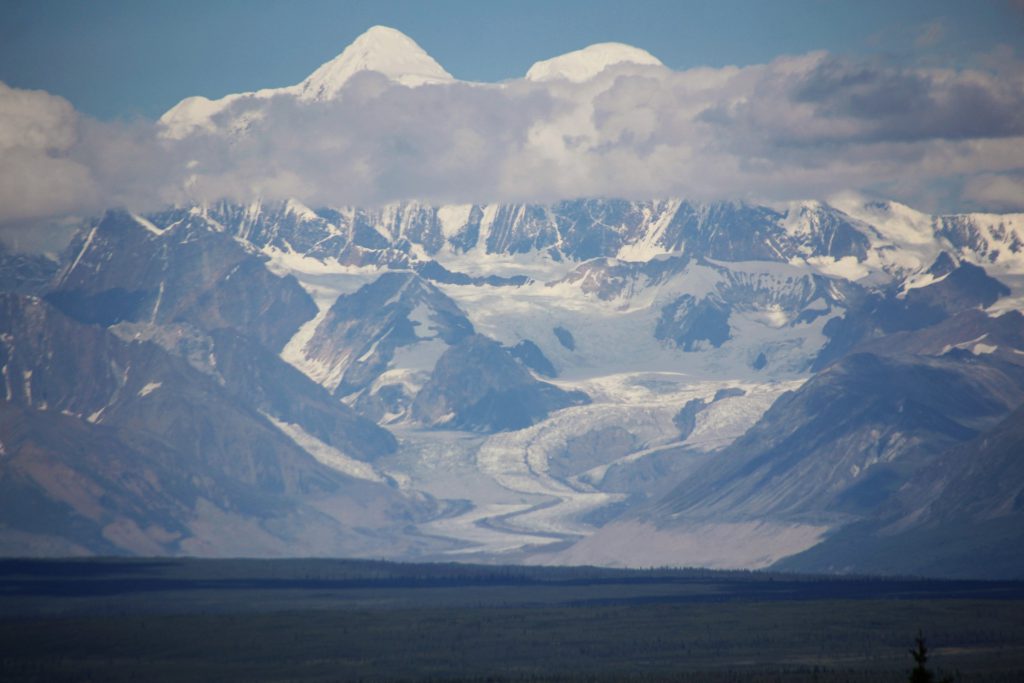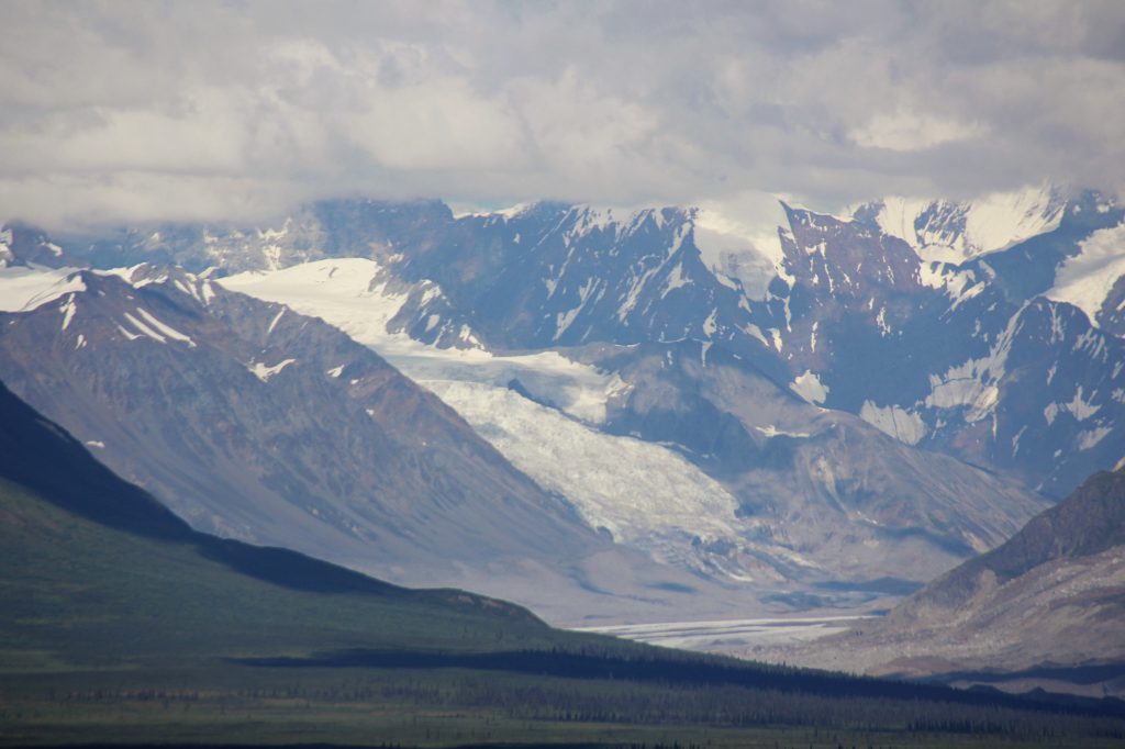 Der nächste Tag begann etwas bewölkt und die Landschaft wurde zunehmend flacher und noch mehr zur klassischen Tundra. Doch es dauerte nicht lange, bis die Alaska Range wieder in der Ferne auftauchte und uns Aussicht auf zahlreiche Gletscher bescherte.