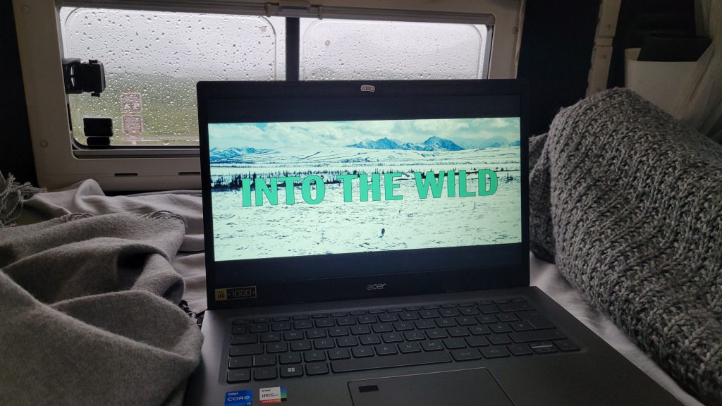 Auch für die zweite Nacht fanden wir wieder einen spektakulären Platz mit Aussicht (und Blaubeeren). Wir nutzten den Nachmittag und die einmalige Kulisse für ein bisschen Arbeiten und Sport. Irgendwann holten uns dann Wind und Regen ein und wir machten es uns drinnen mit dem Film „Into the Wild“ (siehe letzter Reisebericht) gemütlich. Tatsächlich erkannten wir einige Orte aus dem Film wieder und fanden hier erst heraus, dass er tatsächlich entlang des Denali Highways gedreht wurde, da der Originalschauplatz der Geschichte (auf dem Stampede Trail, hinter Healy) zu schwer zugänglich war für das Filmteam.