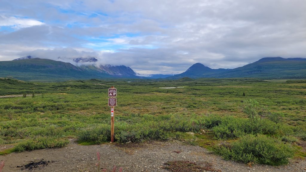 Inzwischen war es schon Nachmittag und für Wanderungen oder Fahrradtouren war es zu spät. Dennoch fuhren wir die für PKWs und Vans freigegebenen 15 Meilen der Parkroad ab, um schon mal einen Eindruck vom Nationalpark zu erhalten. Und auch wenn der Denali sich inzwischen in Wolken gehüllt hatte – die Tundra-Landschaft war mega beeindruckend.
