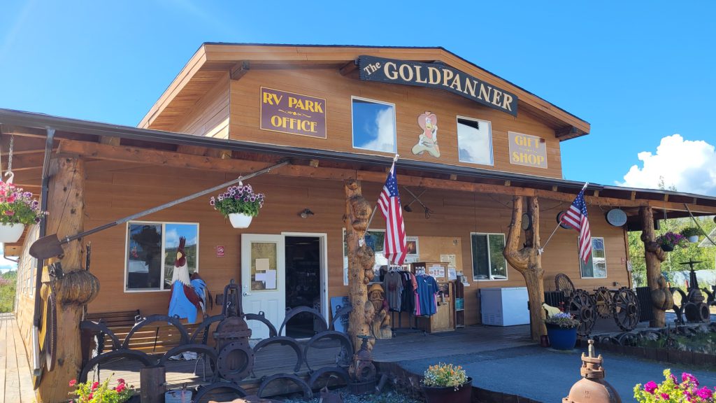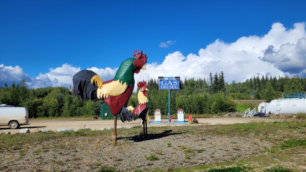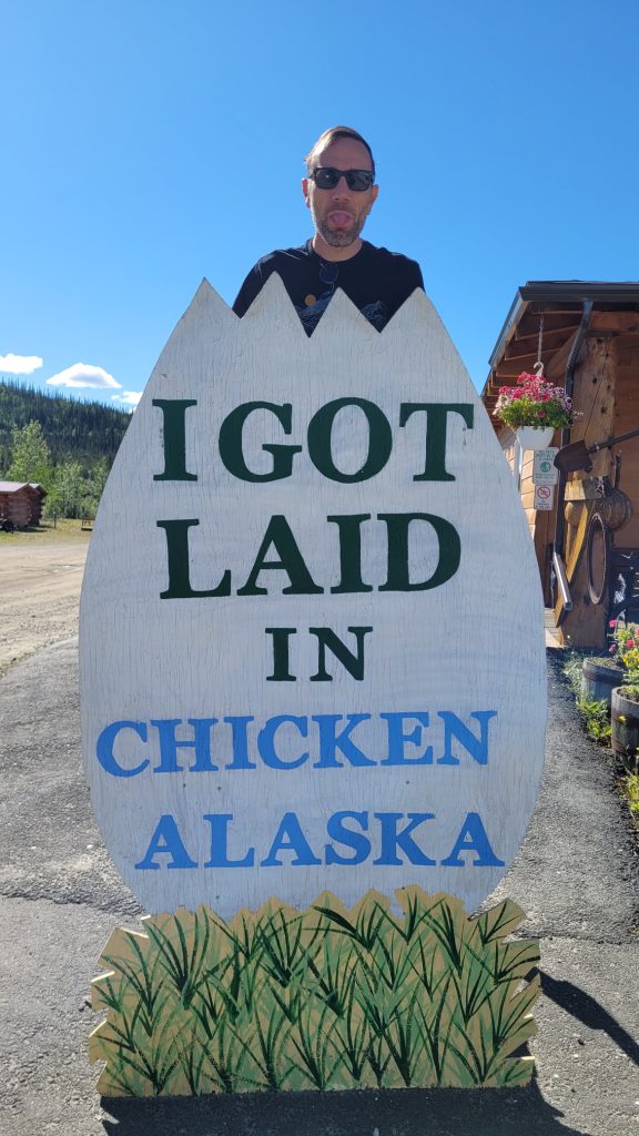 Bevor wir zum Grenzübergang zurück nach Kanada gelangten, kamen wir noch im Dörfchen Chicken vorbei. Ja, das heißt wirklich so und verdankt seinen Namen angeblich den frühen Goldgräbern, die in dieser Gegend lebten. Sie wollten den Ort nach den hier häufig vorkommenden Alpenschneehühnern benennen, die Ptarmigan heißen. Da man sich aber bzgl. der Schreibweise nicht sicher war, wählte man das geläufigere Wort Chicken – so geht zumindest die Legende.