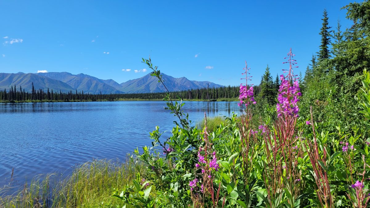 Erstmal genossen wir den Ausblick auf den großen weißen Berg, eingerahmt von Fireweed-Blüten und dem Susitna Fluss im Vordergrund. Was für ein Panorama!