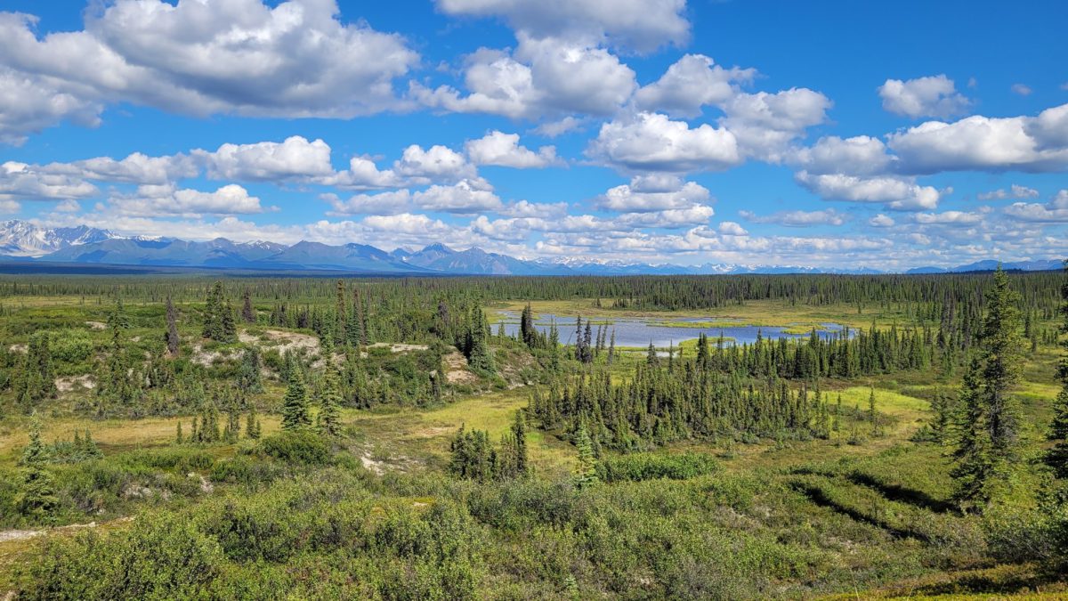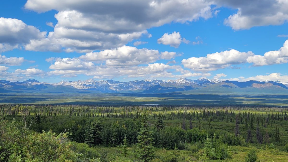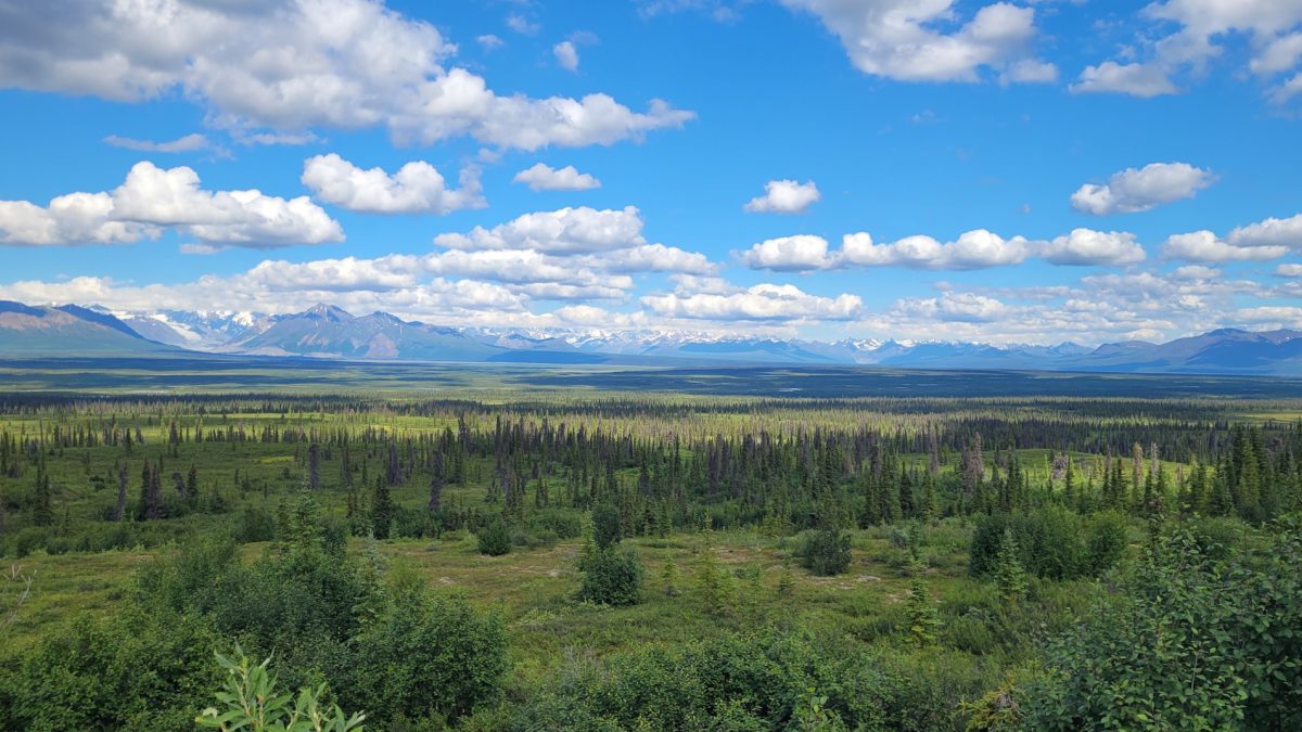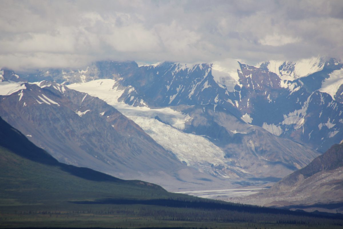 Der nächste Tag begann etwas bewölkt und die Landschaft wurde zunehmend flacher und noch mehr zur klassischen Tundra. Doch es dauerte nicht lange, bis die Alaska Range wieder in der Ferne auftauchte und uns Aussicht auf zahlreiche Gletscher bescherte.