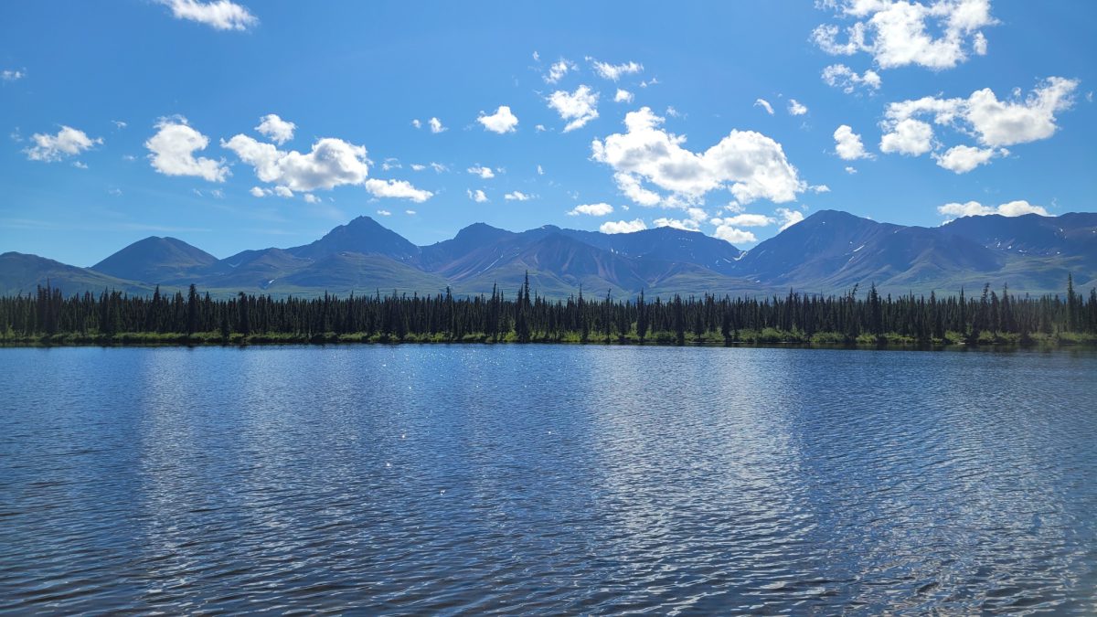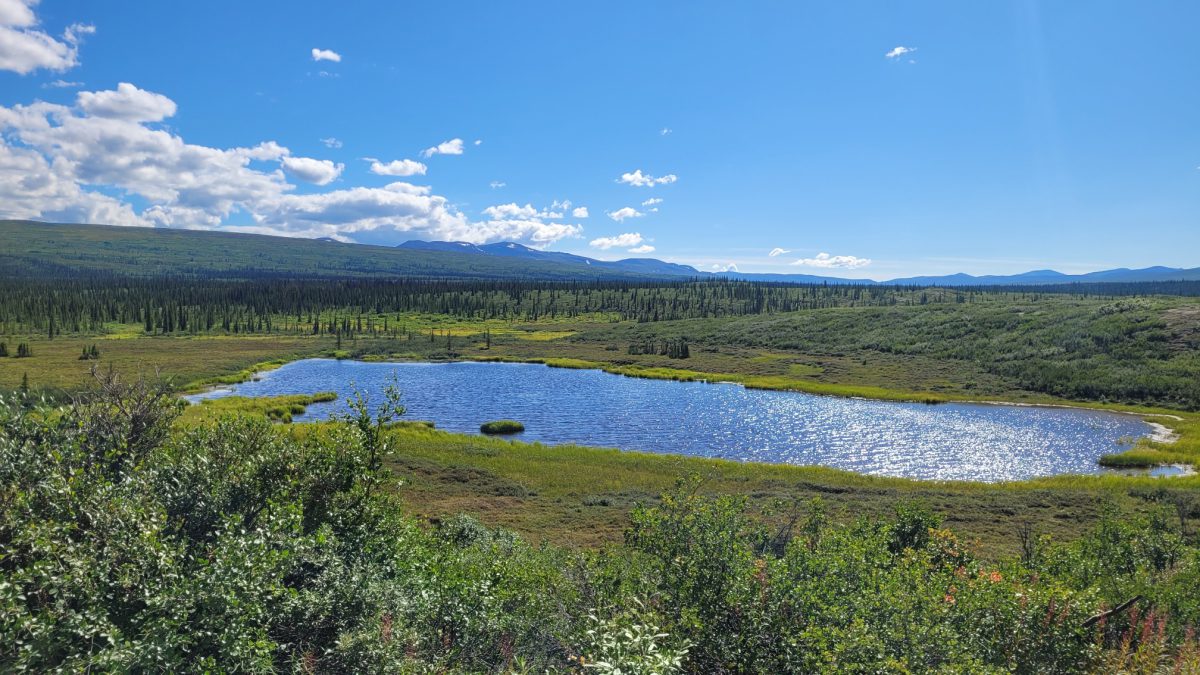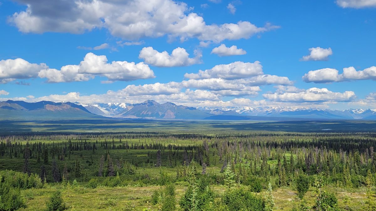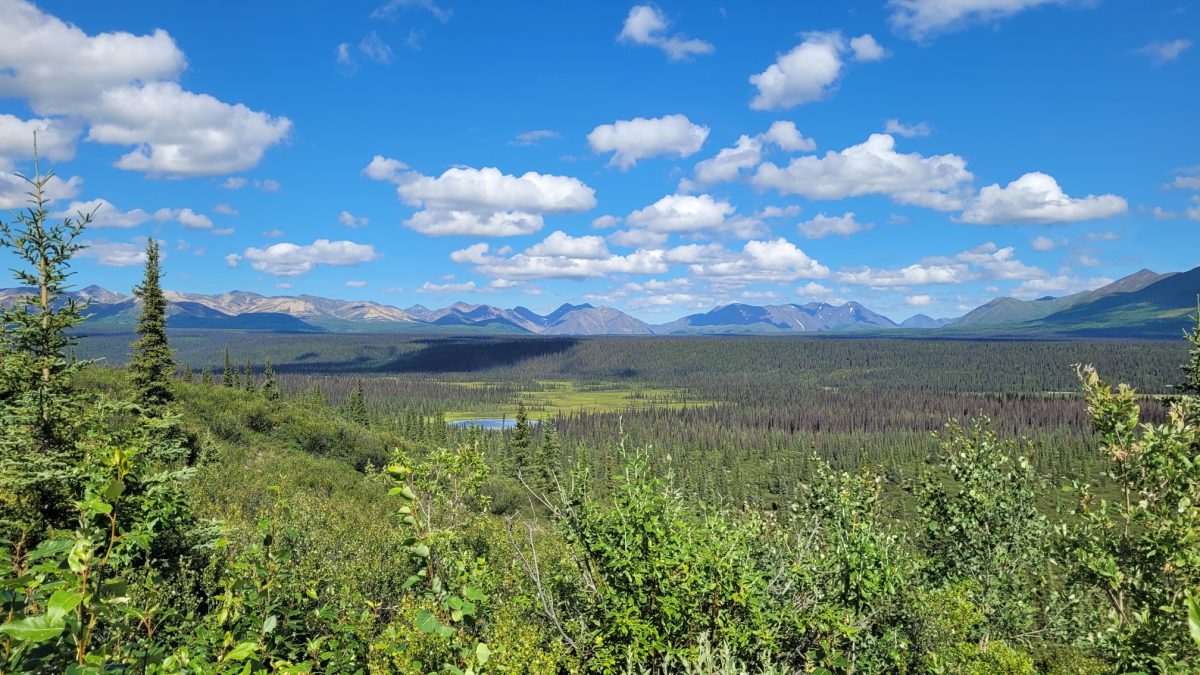 Der nächste Tag begann etwas bewölkt und die Landschaft wurde zunehmend flacher und noch mehr zur klassischen Tundra. Doch es dauerte nicht lange, bis die Alaska Range wieder in der Ferne auftauchte und uns Aussicht auf zahlreiche Gletscher bescherte.